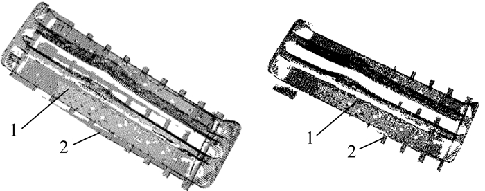 | 1—零件扫描点云 2—后景点云 图 5 示例零件的3D点云扫描结果(左、右图分别为后景去除前、后) |