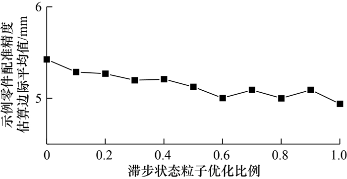 对于不同比例的粒子应用滞步系数后,示例零件配准精度估算边际平均值如图 7所示。由图可知,随着应用滞步系数的粒子比例增加,示例零件的配准精度估算边际平均值前半段总体呈下降趋势;当对60%的粒子应用滞步系数后,估算边际平均值开始产生波动。综合考虑配准精度和粒子多样性,对60%的粒子应用滞步系数。