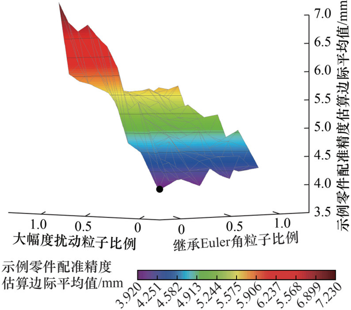 继承Euler角与大幅度扰动两者的应用比例交互作用影响下,示例零件配准精度估算边际平均值3D视图如图 8所示。由图可知,在继承Euler角与大幅度扰动的交互作用下,示例零件配准精度估算边际平均值发生剧烈变化。其在继承Euler角粒子占比为20%,大幅度扰动粒子占比20%时达到最小值, 对应图中底侧中央的黑点。