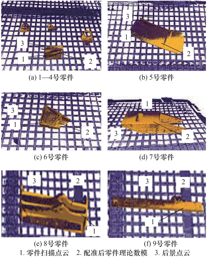 4.2 多种类零件配准效果分析为验证应用优化措施应用粒子占比的匹配效果,特在一个筛盘上的不同位置摆放9种大小、颜色、形状均不同的零件各一个, 以验证算法鲁棒性。其2D图像检测效果如图 3所示,可以看出2D图像处理能够将零件准确分割;3D点云扫描结果与配准结果如图 9所示。虽然3D点云有很强的背景点云(网格筛盘)干扰,但自动分割后的扫描点云基本包络重构零件,展现了优良的配准效果。