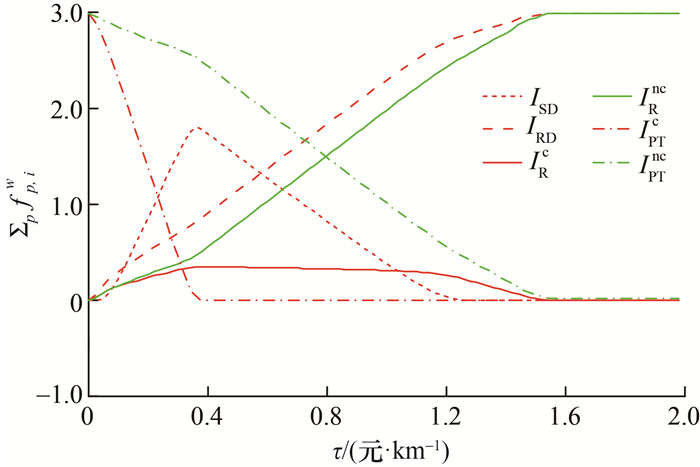 由图 3可知,当τ超过某一阈值时,无论是有车用户还是无车用户,几乎都不会选择乘坐公交出行;IPTc的τ阈值约为0.4元/min,IPTnc的该阈值约为1.5元/min。同时,ISD的路径流量达到峰值后开始下降,并最终接近于0。这一现象产生的原因是:随着τ上升,大量无车用户的选择开始从IPTnc转向IRnc,使共乘需求迅速增加,从而吸引了出行模式为ISD的出行者参与共乘。甚至在τ≥1.2元/min后,有车的共乘乘客也开始转变为共乘司机,即出行模式由IRc转变为IRDc或IRDnc。当τ≥1.5元/min后,几乎所有的有车用户都选择IRDnc出行,无车用户都选择IRnc出行。这一过程表明,在共乘出行和常规公交共存的交通网络中,也许可以找到一个最佳的公交票价,使系统的收益最高,或道路上的车辆数目最少。这为公交公司和交通管理者制定票价提供了有效依据。
