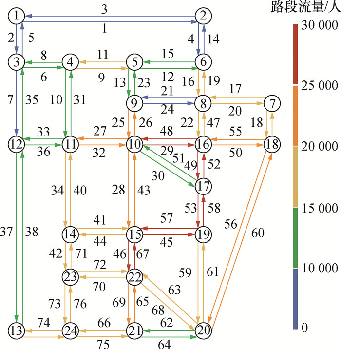 同时初始化算法参数δ=0.2,μ=0.9,ε=0.01。PSAP算法在完成11 060次迭代、用时40.77 h后满足收敛条件,所得网络路段流量如图 5所示。