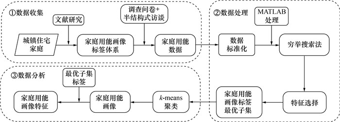 1.4 家庭用能画像建模方法城镇住宅家庭用能画像建模方法如图 1所示。建模方法分为3个步骤:1) 数据收集。首先基于文献研究法构建家庭用能画像标签体系,再通过调查问卷和半结构式访谈收集城镇住宅家庭用能数据,包括家庭属性、建筑特征、家电设备、用能行为、能源消耗以及可再生能源使用等数据。2) 数据处理。通过穷举搜索法和向后特征选择法对家庭用能画像标签进行特征选择,构建家庭用能画像标签最优子集。3) 数据分析。使用k-means算法将家庭进行聚类,分析不同类型家庭在家庭属性、建筑特征、家电设备、用能行为、能源消耗以及可再生能源使用维度的画像特征。