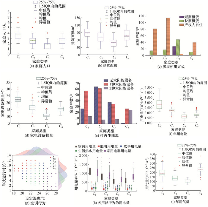 通过家庭用能画像标签最优子集的8个标签,可分析京津冀地区4类城镇住宅家庭的用能特征,如图 7a—7g和7i所示,此外图 7h分析了各用能行为的用电量。其中1.5IQR代表 1.5倍四分位距(interquartile range,IQR)。由图 7和表 1可知,第1类家庭(C1)的家庭人口、建筑面积、家电设备数量、空调单次运行时长和年用电量在4类家庭中均值最高,且空调温度设定最低,此类家庭在日常生活中偏向舒适环境,不在意能源消耗,不关心能源费用支出,特别注重生活的品质,因此将该类家庭命名为用能品质型家庭;第2类家庭(C2)的家电设备数量、空调单次运行时长和年用电量均值较高,且空调温度设定较低,太阳能设备拥有率最低,此类家庭的节能意识亟待提高,用能行为习惯亟待改变,节能潜力最大,因此将该类家庭命名为节能潜力型家庭;第3类家庭(C3)的家庭人口、建筑面积、房屋使用方式、家电设备数量和年用气量在4类家庭中均值最低,通过访谈可知此类家庭空调运行时间基本集中在夜间,家中白天通常无人,用能主要集中在早晨和夜间,因此将该类家庭命名为用能规律型家庭;第4类家庭(C4)的空调单次运行时长和年用电量均值最低,空调设定温度和年用气量均值最高,且太阳能设备拥有率最高,此类家庭倾向于节约能源,有较强的环保意识,因此将该类家庭命名为节能环保型家庭。