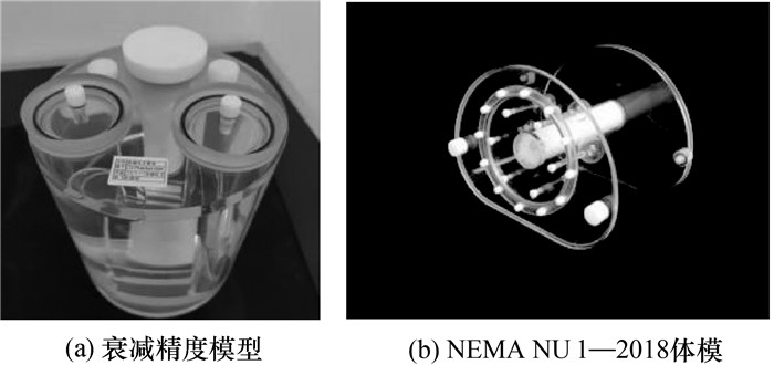 1.3 模型试验SPECT/CT成像系统定量标定可实现图像定量转换。为评估系统的定量准确性,本文基于衰减精度模型和NEMA NU1—2018体模进行试验和分析,实物模型如图 2所示。