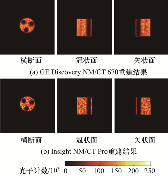 本研究对Insight NM/CT Pro和GE Discovery NM/CT 670成像系统设置相同采集条件进行数据采集。采集条件如下:SPECT扫描时矩阵大小设置为256×256,双探头以H模式扫描,每个探头扫描范围为180°,步进3°,放大倍数为1,采用双能窗采集,主能窗为126~154 keV,低能窗为114~126 keV,扫描过程中启用轮廓跟踪;CT图像均采用轴扫,扫描范围为500 mm×500 mm,转速为1 r/s,高压为120 kV,电流为100 mA,以标准滤波器进行滤波反投影重建,重建矩阵大小为512×512。SPECT重建参数采用各系统默认参数,即GE Discovery NM/CT 670成像系统子集数为10,迭代次数为2,无后滤波;Insight NM/CT Pro成像系统子集数为4,迭代次数为10,无后滤波。2个不同成像系统均需进行空间分辨率恢复校正、散射校正和衰减校正,衰减校正过程使用的衰减图均由各系统重建后的CT图像转换获得。