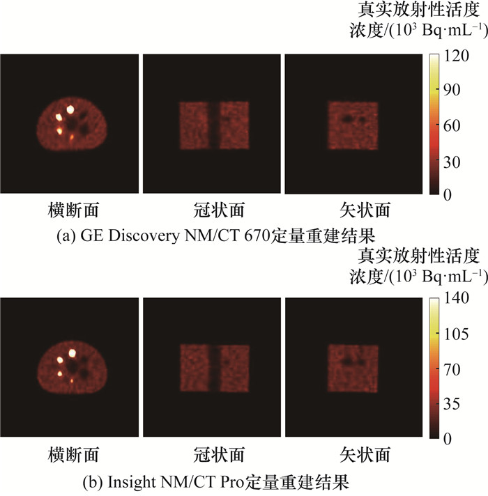 图 5为不同成像系统NEMA NU 1—2018体模定量重建结果对比。可以看出,在同一层面上,GE Discovery NM/CT 670的定量重建图像中“冷区”小球和肺插件部位的边缘相对模糊,且与背景区域的对比度相差较小;而Insight NM/CT Pro的定量重建图像中“冷区”小球和肺插件部位的边缘相对清晰,与背景区域的对比度相差较大,表明其更能展现真实放射性活度浓度。