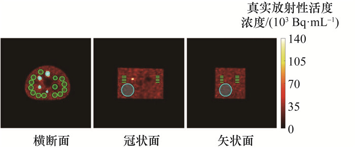 其中:atrue为真实放射性活度浓度,计算时需要充分考虑核素随时间衰变的作用,Bq/mL;CR为重建图像VOI内的光子计数均值;T为单角度采集时间,s;PX、PY和PZ分别为X、Y和Z这3个方向的单像素大小,mm;Apre、Apost分别为注射前药物活度和注射后药物活度,Bq;V为模型中水的体积,cm3;tpre、tpost、tscan和t1/2分别为开始注药前时刻、注药后时刻、开始扫描时刻和核素半衰期,s。