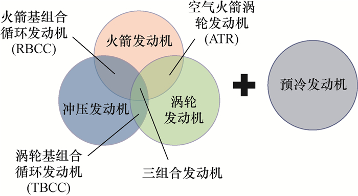 动力系统作为动力来源,是飞行器的重要组成部分,高性能的飞行器必须具备高性能的动力系统与之匹配。现有成熟的动力系统包括涡轮/涡扇发动机、火箭发动机、冲压发动机,在工况和性能上都存在局限性,不能满足多工况、大速域的需求。组合发动机具备多种基础发动机的优点,是目前主要的发展方向之一,其现有的分类如图 1所示,包括涡轮基组合循环发动机(turbine based combined cycle,TBCC)、火箭基组合循环发动机(RBCC)、空气涡轮火箭组合循环发动机(ATR)、三组合发动机、预冷型组合循环发动机等。