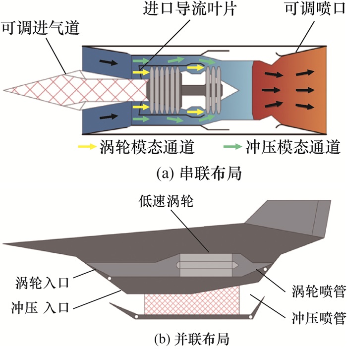 TBCC有单通道、双通道2种布局。双通道布局下,涡轮和冲压发动机上下分布,共用进气道和喷管扩张段,通过进气道斜板调整工作模态。单通道布局分为串联、并联2种,如图 2所示。串联时,冲压发动机置于涡轮发动机后方,通过气动阀门调节工作模态;并联时,涡轮和冲压发动机轴向分布。2种布局方式各有优劣。串联布局的尺寸、质量小,迎风阻力小,低速性能好,但在高Ma条件下飞行时涡轮发动机的性能受限,飞行速度上限较低;并联布局的尺寸和质量较大,但能更好发挥冲压发动机的优势,速度上限高[9]。因此,双通道或并联式TBCC非常有可能成为未来高超声速飞行器的最佳动力方案。