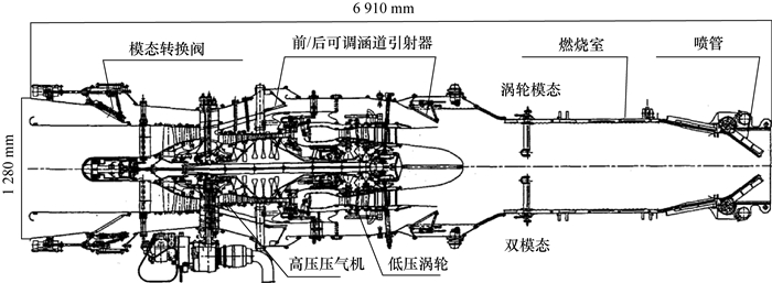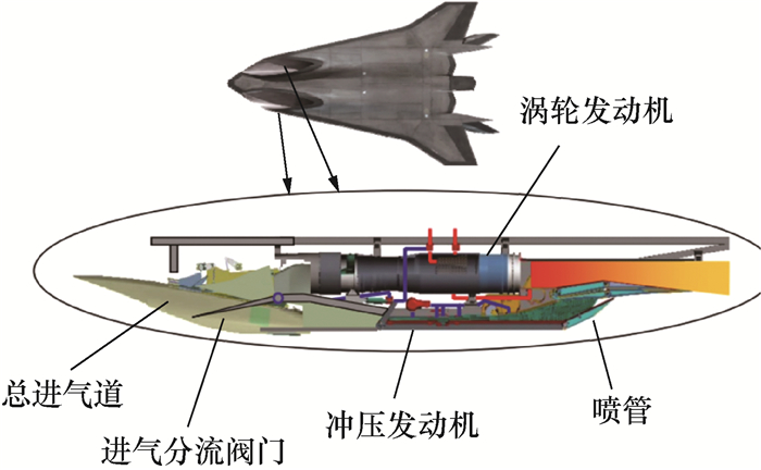 美国于20世纪中期开始探索组合发动机技术,经历了SR-71、RTA计划、FaCET计划、SR-72计划等时期。20世纪60年代,美国研发出Ma突破3的飞行器SR-71“黑鸟”侦察机,其动力系统J-58改进型是世界上第一种投入航空使用的串联TBCC发动机[10],如图 3所示。J-58改进型在原有J-58的结构基础上,添加了变循环旁路,使得发动机在高Ma条件下能以冲压发动机模态运行,最大飞行速度Ma能达到3.2[11]。由于结构复杂,J-58并未大规模装备使用,但对TBCC研发具有里程碑式的意义。