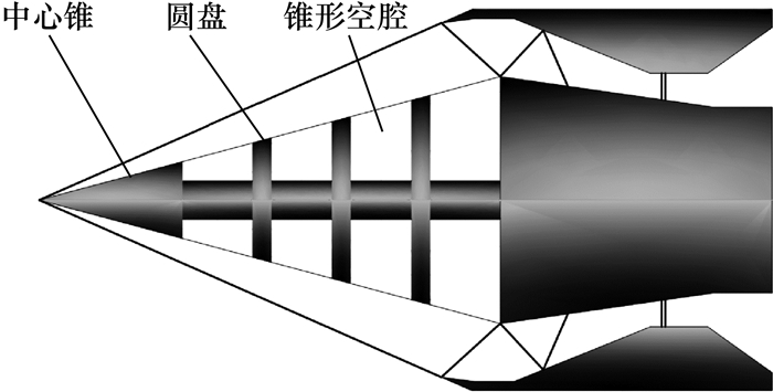 2002年,为改善高速轴对称式进气道在低速时的气动缺陷,日本提出了MRD轴对称式进气道,如图 7所示。由图可知,该设计在激波锥后设置了几道圆盘,通过改变圆盘间空腔面积,调节来流流量和压缩效率[46]。风洞试验结果表明,这种设计不仅不会对附面层的边界线产生不利影响,还能减少气流损失,极大地优化了非设计点下的性能。来流流量不变的情况下,MRD的总压恢复系数比无空腔设计提高了10%[30]。