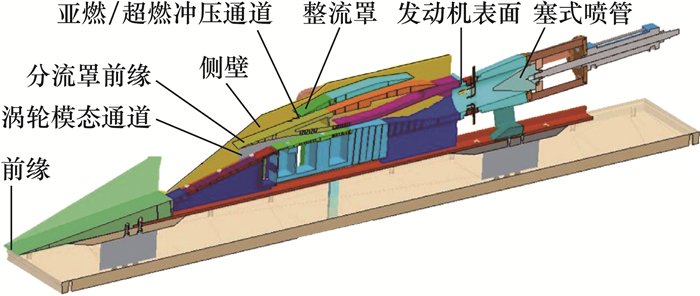 3.2 TBCC推进系统相关技术 3.2.1 飞发一体化综合模型传统飞行器是将推进系统和机身独立设计,再组装成整机。但在高Ma条件下飞行时,传统构型的气动阻力非常大,对推力性能造成极大损失。因此需要将推进系统和机身进行一体化设计,使整机的外形呈高度流线化以减小气动阻力,提高飞行器的速度上限。因此,飞发一体化技术在组合动力设计中尤为关键。
