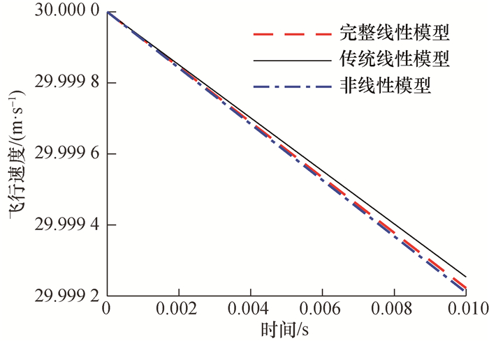 以由弹性本体和刚体舵面组成的刚柔耦合飞行器为例,采用系数冻结法在未扰动弹道上选取的特征点附近对线性化模型进行仿真分析。在选取的未扰动弹道特征点处,飞行器的速度为30 m/s,攻角为25°,舵偏角为15°,舵偏角加速度为150(°)/s2。将本文推导的未作角度简化的线性化模型记为完整线性模型,将把攻角和舵偏角均视为小量、摆动惯性力与力矩仅保留摆动角加速度的增量项、不考虑由静矩变化产生的姿轨耦合项的线性化模型记为传统线性模型。以原始的非线性模型直接计算得到的扰动运动变量值作为准确值,将线性化模型计算得到的运动变量增量值与对应时刻未扰动运动变量值的和作为线性化模型求解的扰动运动变量值。在无外力作用、耦合惯性力只保留舵面摆动惯性力、力矩与模态力,对舵偏角与舵偏角加速度施加5%的扰动量的条件下,完整线性模型、传统线性模型与非线性模型求解得到的飞行速度响应如图 1所示。