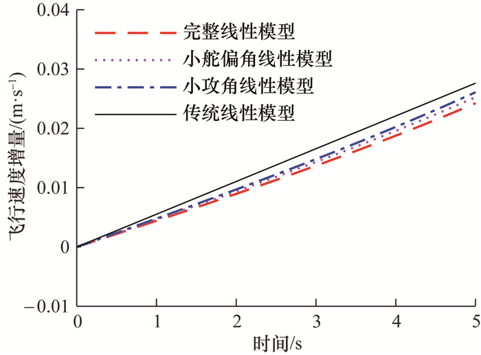 将仅把攻角或舵偏角视为小量的线性化模型分别记为小攻角线性模型和小舵偏角线性模型。在与上文相同的仿真条件下,小攻角线性模型、小舵偏角线性模型、传统线性模型与完整线性模型求解得到的飞行速度增量响应如图 2所示。