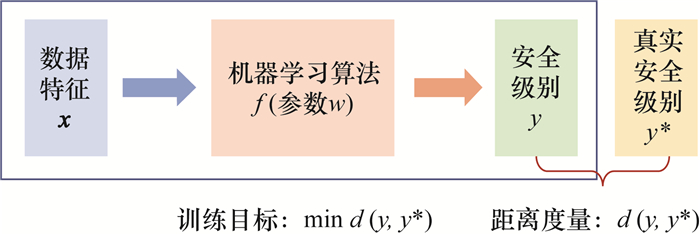 基于机器学习算法构建空管运行数据安全自动分级模型,如图 2所示。图 2中数据特征x=(A1, A2, …, C5)为数据集DAC中的特征项,y*为数据的标签,即安全级别。将数据特征x输入机器学习算法f,则该算法可以输出预测的数据安全级别y=f(x)。机器学习算法f包含可训练参数w,通过优化机器学习算法预测的安全级别y与真实的安全级别y*之间的距离d(y, y*)来迭代更新机器学习算法的参数w,可以训练得到自动分级模型。