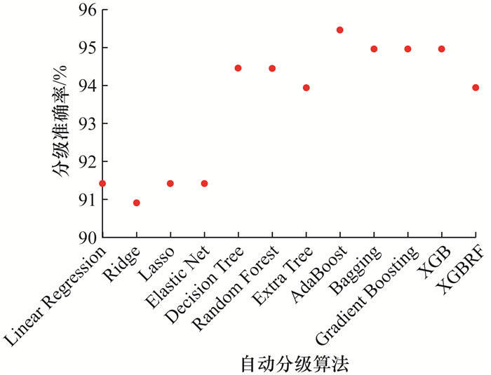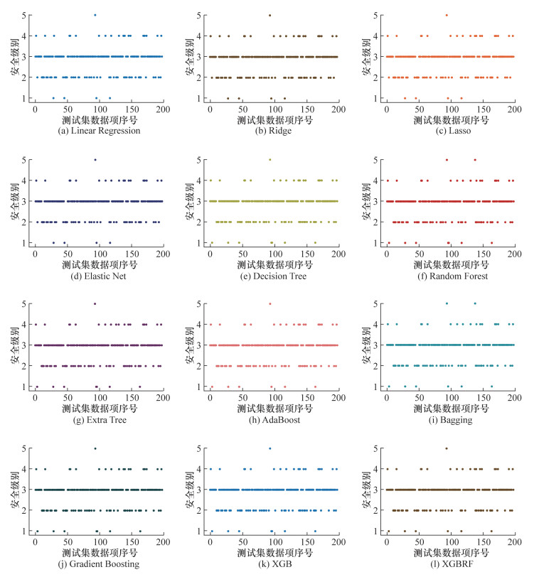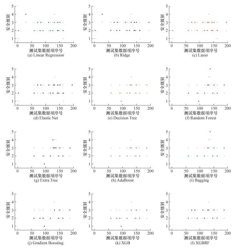 将本文所提方法与Linear Regression[20]、Ridge[21]、Lasso[22]、Elastic Net[23]、Decision Tree[19]、Random Forest[24]、Extra Tree[25]、Bagging[26]、Gradient Boosting[27]、XGB(extreme gradient boosting)[28],XGBRF(extreme gradient boosting random forest)[29]等机器学习方法在训练集上进行训练,并在测试集上进行对比。全部12种自动分级算法在测试集上的分级结果如图 5所示。将图 5与4进行对比分析可知,全部算法在测试集中的大部分样本上都预测出了正确的安全级别。