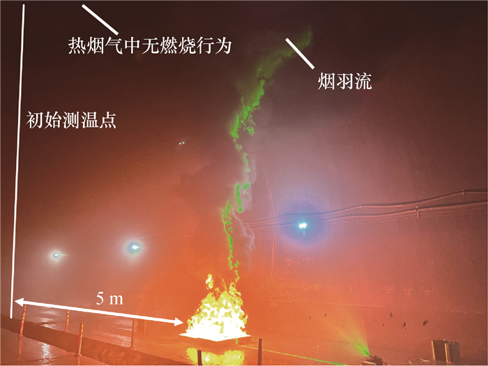 此外,全尺寸实验中架设了高清摄像机与片状光源以获取火源的燃烧状态和冲击顶棚的火羽流类型。高清摄像机为索尼FDR-AX60型号4K摄像机,可记录每秒50帧的高清火源燃烧画面;片状光源由型号为LWPIV-3WM的激光发射器产生,厚度和扇面角度分别为1.5 mm和120°。