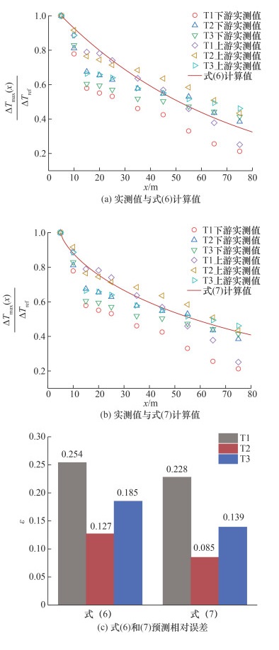 根据式(6)和(7)的计算值,本文开展了调整后模型与T1、T2和T3火灾实验温升数据的对比,如图 11a和图 11b所示。为进一步量化模型的预测精度,本文参考文[10]定义了温升纵向衰减预测相对误差的计算方程:
