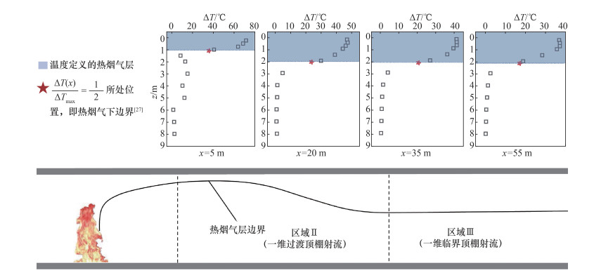 相对而言,式(5)在推导过程中考虑了换热系数、换热边界以及质量流量等参数在纵向流动过程中的演化行为,以x为自变量构建了上述流动和传热参数的演化方程,这解释了式(7)对于本文全尺寸实验的ε较小。然而,田向亮等[14]是基于实验数据非线性拟合得出了热烟气流动和传热参数演化方程的经验解,即式(5)中K2和K3。尽管式(5)一定程度上弥补了式(4)在预测全尺寸实验温升衰减的短板,但是转化后的式(7)中经验参数-0.04和0.72在部分区域不能完全描述本文中高铁隧道火灾热烟气最大温升纵向衰减行为,具体见图 11(b)中x < 35 m区域。图 12中,参考文[27]定义热烟气层的方法,根据T3下的热烟气温升数据可知高铁隧道内的烟气层厚度在纵向上呈现出2个明显分区,即区域Ⅱ(一维过渡射流区)和区域Ⅲ(一维临界射流区),并且具体的分界线在20 m < x < 35 m范围内,这与文[10, 27]中的隧道火灾研究结论基本一致。