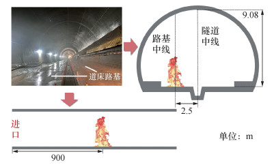 白家山高铁隧道横截面为弧形几何构型,拱顶与道床路基表面的垂直距离为9.08 m。单洞双线隧道内布置有双道床,道床路基中线与隧道中线距离为2.5 m。考虑到道床的实际位置,本文火灾实验涉及的火源位置沿着路基中线布置。另一方面,考虑到不影响隧道的施工进度以及减少隧道开口边界对于实验结果的影响,实验的火源位置位于距离隧道进口约900 m处,如图 2所示。