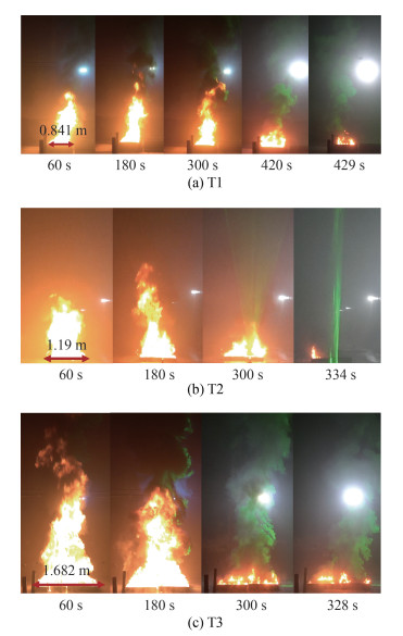 文[8]测定的汽油燃烧热为43.7 MJ/kg,且假定汽油油池火燃烧效率为0.8,结合式(1)计算的每个工况单位面积质量损失率和表 1中燃烧面积,可以推算出本文中T1、T2和T3对应的火源热释放速率计算值分别为0.38、1.01和2.52 MW。但是上述计算值仍然与实际值存在差异,为进一步定量化分析火源燃烧状态的状态,本文根据油池火火焰高度与火源热释放速率的正相关关系[8],基于火焰高度—时间曲线反推每个工况下火源热释放速率时间演化特征,从而定量分析每个工况的火源燃烧状态。图 5中火源高度曲线是根据处理后的火焰二值化图像视频(本文中的亮度阈值设定为220),结合图像像素点与实际距离的比例关系获取的[12]。可以看出,推测出3个工况均不存在明显的燃烧发展阶段,并且稳定燃烧阶段(未出现明显衰减行为)持续时间较长。即使相比T1和T3,T2具有相对明显的燃烧发展阶段(约30 s),但是该阶段相对于整体较长的稳定燃烧(未出现明显衰减行为)可近似忽略。这表明顶棚下热烟气的扩散行为在相当长的时间段内受到了稳定的火羽流驱动,并且燃烧发展阶段造成的火羽流驱动不均匀的影响可近似忽略。