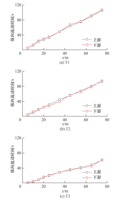 为进一步量化热烟气在纵向方向上的流动速度,本文以表 1中环境温度作为烟气边界分辨的特征温度,绘制了每个全尺寸火灾场景的热烟气纵向流动距离—时间曲线,如图 7所示。可以看出,在没有纵向风干扰条件下,上游与下游的热烟气蔓延速度基本保持一致。根据5.0 m≤x≤75 m范围内获取的距离—时间数据点,T1、T2和T3中热烟气纵向流动的平均速度分别约为0.72、0.80和1.30 m/s。根据2.1节的分析可知,T1、T2和T3中所使用标准火源的热释放速率依次增大,火源的热释放速率对于烟气的纵向蔓延速度有重要的影响作用。Oka等[25]研究了隧道内烟气纵向流动速度分布,针对一维射流区内热烟气最大流动速度的纵向演化特征,建立了无量纲模型:
