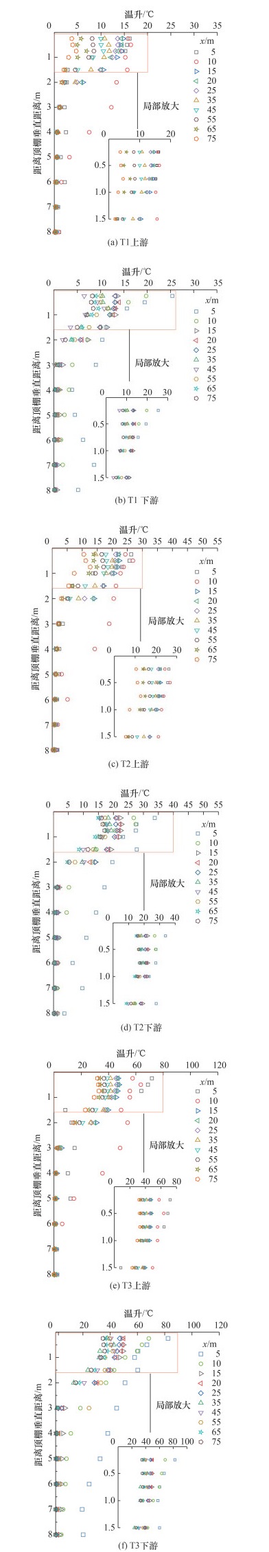 根据火焰高度曲线推测出的火源燃烧状态时间演化特征,本文选取实验开始后30、60、90和120 s 4个时刻的烟气温度场数据,分析烟气纵向的蔓延过程。为便于分析烟气上游、下游蔓延特征,本文定义x′为数据点纵向坐标(上游为正值,下游为负值,零点为火源位置),z为数据点垂直坐标(零点为隧道顶棚顶点即拱顶处,向下为正)。另外,本文定义x为距离火源的纵向距离,并且x=|x′|。图 6中,尽管存在温度采集盲区(-5 m < x′ < 5 m),但是仍可清晰辨识顶棚下火灾热烟气的纵向蔓延特征,并且每个实验场景中的热烟气纵向蔓延速度也表现出一定差异。基于热烟气温度在不同时刻的纵向分布,可以大致推断出火灾热烟气在T1、T2和T3中的纵向蔓延速度依次增大。