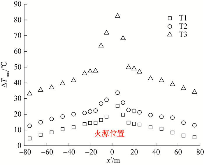 图 8中烟气层垂直温度呈“top-hat”分布,显示高铁隧道内火灾烟气纵向蔓延过程中,垂直方向最大温度的所在位置不固定并且不紧贴顶棚下表面。考虑到测温电缆的探头在垂直方向上的排列间距,为避免测温探头测定的最大温度不是真实值,参考文[10, 30]中方法,本文采用3个测量值的二次拟合(测量最大值和2个相邻的测量值)来估计最大温度值。基于实验数据估计的热烟气最大温升ΔTmax,分别按照在烟气上游、下游对应的纵向位置进行排列,见图 9。可以看出,3个火灾场景的热烟气最大温升纵向衰减行为在上游、下游呈现出的特征基本一致,并且衰减的阶段分布也与文[17]模型的相似。但是针对现有火灾烟气温升纵向衰减模型是否适用于高铁隧道,仍需要开展定性分析。