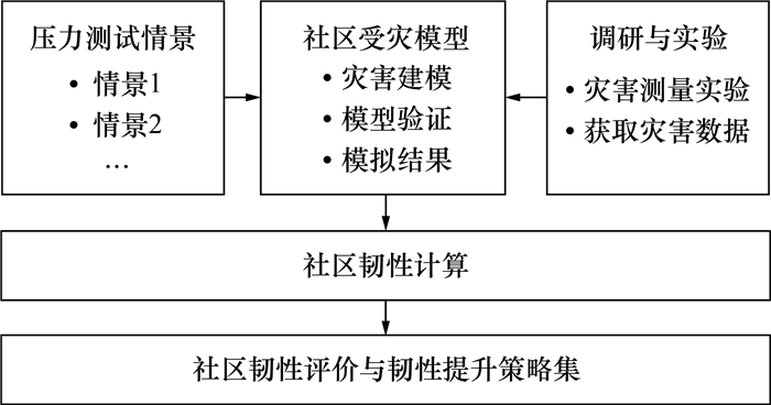 然后构建社区受灾模型。选取合适的灾害模型(如数值模拟、机器学习等)模拟社区在压力测试情景下的破坏和恢复情况。借助社区实地调研和灾害测量实验,获取实际灾害数据,完成灾害模型的参数率定和验证,进而获取高精度的灾害模拟结果。