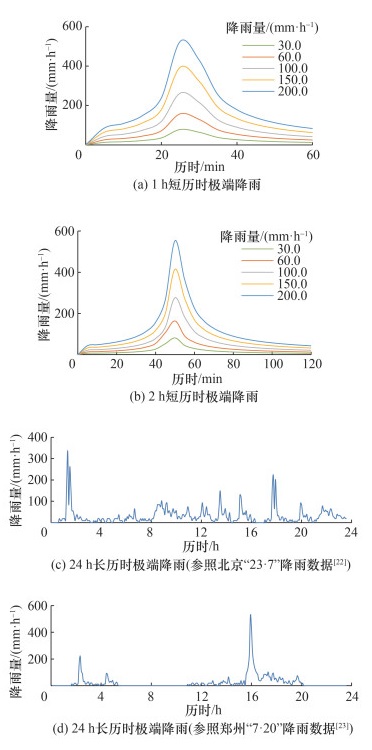 雨强设计参考北京2023年7月(简称“23·7”)特大暴雨以及郑州“7·20”特大暴雨强度。北京“23·7”特大暴雨的最大小时雨强达111.8 mm[22]。降雨雨型设计依据2.3节暴雨内涝测量实验监测得到的降雨量时间序列数据(2023年7月30日0∶00~24∶00)。由于监测点位雨强未达到灾害最大降雨强度,通过对实际观测降雨序列进行同倍比、同频率的控制缩放,使最大小时雨强达到111.8 mm,此时24 h降雨量为740.0 mm。郑州“7·20”特大暴雨情景24 h降雨量达552.5 mm,小时降雨量最高达201.9 mm[23],降雨量时间序列暂无公开资料。本文参考《标准》中的附录A.2 Ⅱ区24 h雨型分配表[21]设计该降雨:整体由2个雨峰组成,主峰小时降雨量最高达201.9 mm,24 h总降雨量达552.5 mm。