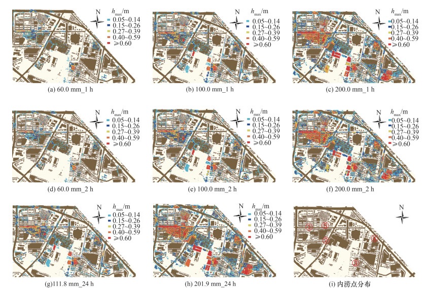 基于水动力模型完成12个压力测试降雨场景的仿真计算,得到不同场景下J社区的暴雨内涝模拟结果。本文选取60.0、100.0、200.0 mm/h短历时极端降雨与2个长历时极端降雨场景下的模拟结果做出展示,图 6a—6h显示了当St达到最大时h的分布情况。由图可知,随着降雨强度的增大,最大淹没面积(Smax)和最大积水深度(hmax)均逐渐增加。该社区存在不同程度的内涝情况,内涝点分布如图 6i所示。