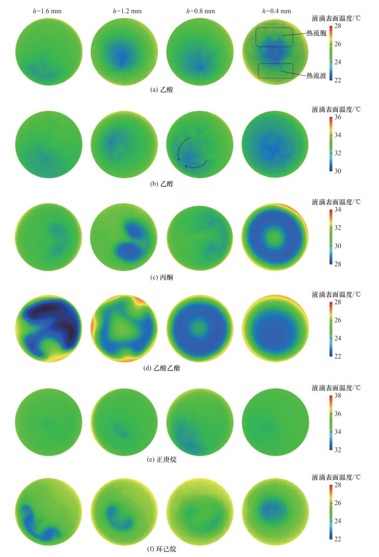 乙酸乙酯液滴表面温度分布随高度的变化如图 3d所示。当h=1.6 m时,乙酸乙酯液滴表面被非对称涡流热流型占据。随着液滴高度逐渐降低,由于液滴顶部与基底热表面的温差增大,导致液滴内部法向温度梯度作用增强,产生浮力对流,使液滴底部靠近基底的高温液体流至液滴顶部;当h=1.2 mm时,乙酸乙酯液滴表面热流型逐渐由涡流热流型向环状热流型转变,处于过渡时期。当h=0.8 mm时,乙酸乙酯液滴表面温度分布与丙酮液滴(h=0.4 mm)的表面温度分布相似,液滴表面出现中心与三相线高温区域,2个区域之间出现环状低温区域。当h=0.4 mm时,乙酸乙酯液滴表面温度分布已由环状温度分布逐渐转变为表面中心低温分布。乙酸乙酯和丙酮液滴受热蒸发均出现一种环状低温热流型。Ye等[34]发现,在低压纯蒸汽环境下,水滴的蒸发过程出现该环状低温热流型,可以推断存在极性分子的溶剂液滴蒸发可能出现此类热流型。