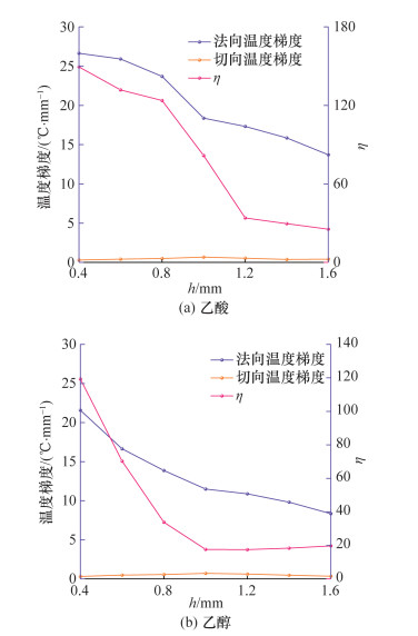 | 图 5 法向和切向温度梯度的变化以及η随液滴高度的变化关系 |