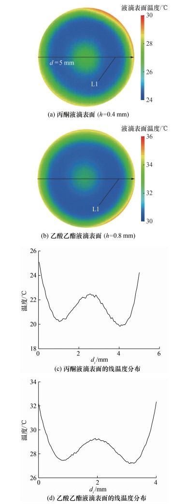测量并记录沿液滴表面的切向温度分布,以验证液滴表面直径线L1的温度梯度存在。其中,d为直径。为方便记录,设定L1的方向为从左向右;当径向位置为i时,L1上的对应位置为di。图 7展示了丙酮液滴(h=0.4 mm)和乙酸乙酯液滴(h=0.8 mm)的表面温度分布和沿L1的温度分布。由图可以看出,在液滴顶部中心和三相线附近,表面温度明显增大。
