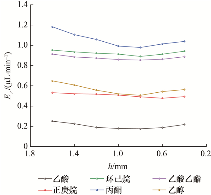 由图 9可以看出,燃料的蒸发速率由大到小排序为丙酮、环己烷、乙酸乙酯、乙醇、正庚烷、乙酸。通过比较6种物质的饱和蒸气压发现,蒸发速率大小主要取决于饱和蒸气压。在某温度条件下,当空气中某种物质蒸气的分压没有达到该物质的饱和蒸气压时,会产生由液态向气态转化的相变,即发生蒸发现象。因此,一种物质的饱和蒸气压越大,越易蒸发,直至空气中该物质的分压(或者说浓度)达到饱和蒸气压才会达到平衡状态。根据Lange化学手册,本实验所选的6种燃料的饱和蒸气压按由大到小排序为丙酮、环己烷、乙酸乙酯、乙醇、正庚烷、乙酸(见表 2)。此排序与本实验结果完全相符,即6种物质的饱和蒸气压大小排序是空气中6种物质的蒸气含量排序,同时也是蒸发速率大小排序。因此,在同一工况下,无论液滴高度为多少,乙酸液滴的蒸发速率最小,丙酮液滴的蒸发速率最大。