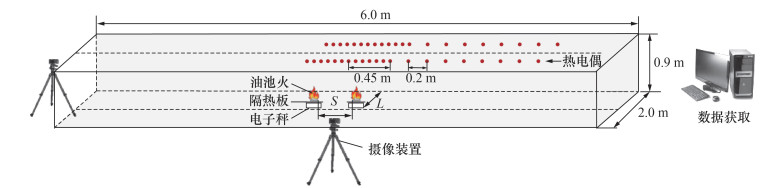 综上,已有关于隧道双火源的研究主要集中在隧道中心线上改变火源间距、火源尺寸等参数方面。在实际隧道火灾事故中,发生双火源火灾的位置是随机的,也可能在不同的横向偏距处,且横向偏距也是隧道火灾研究的重要参数[17]。因此,笔者拟开展对称双火源燃烧实验,研究火源间距、火源横向偏距及火源尺寸等因素对燃烧行为特征及烟气最高温度沿隧道纵向分布的影响,并深入探讨近火源区域火源间距和横向偏距耦合作用下的烟气最大温升变化规律,构建温升预测模型,以期为隧道火灾的探测和防排烟系统设计提供参考。