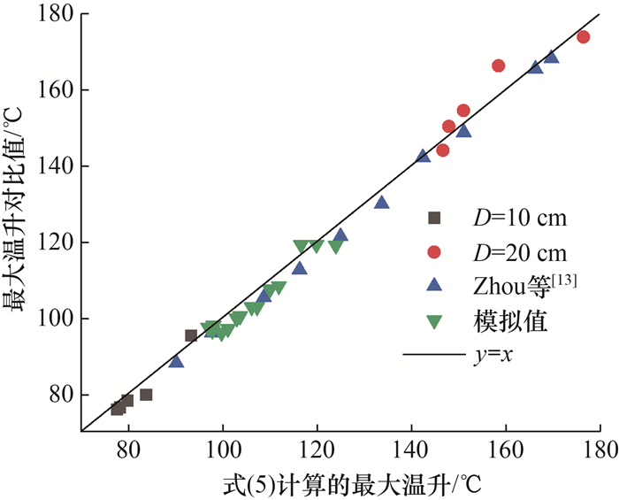 结合式(2)—(4)可得式(5)。式(5)中的λ是一个无量纲修正系数,表示火源不同横向偏距对顶棚下方最大温升的影响。当火源贴壁时,修正系数λ取0.93;当火源非贴壁时,λ则取0.96。将不同横向偏距下双火源火灾的最大温升预测式(5)的计算结果与D=10,20 cm实验值、隧道中心上双火源火灾(S/D=0.5)的火灾动力学模拟器(fire dynamics simulator, FDS)数值模拟值及前人的实验结果进行比较。如图 10所示,预测模型的计算结果与实验和模拟结果吻合较好。因此,在获得火源热释放速率、火源距顶棚的高度、双火源间距(0 < S≤4D)、火源横向偏距以及隧道宽度的基础上,可以根据式(5)求得不同横向偏距下双火源火灾发生时顶棚下方烟气的最大温升。