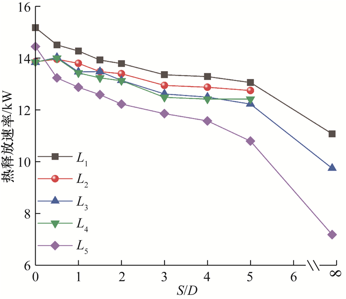 | 图 4 对称双火源的热释放速率随S/D的变化(油池A) |