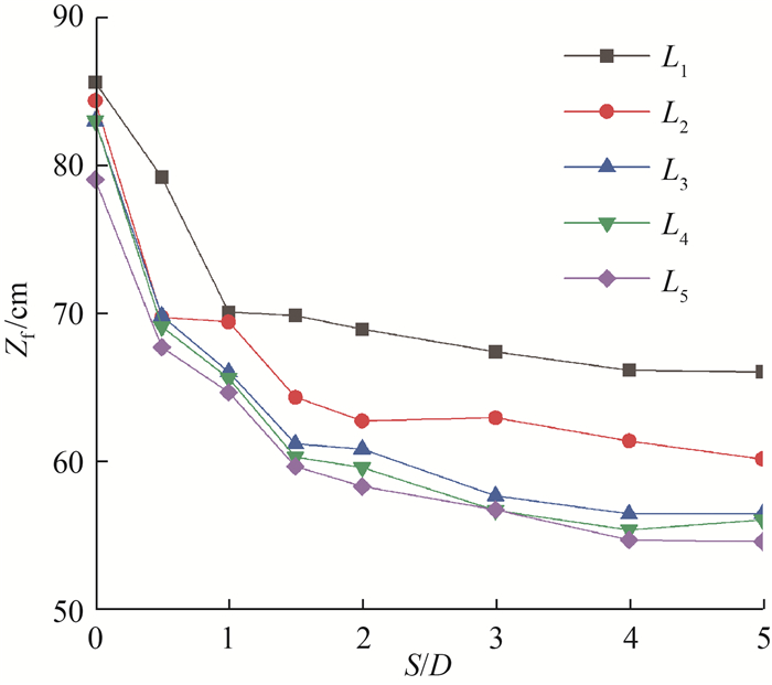 3.2 火焰高度根据火焰出现的概率云图确定火焰高度。取火焰出现在某个位置的频率达到50%对应的高度作为火焰的平均高度(Zf),即火焰间歇概率为0.5的高度。图 6为不同横向偏距下对称双火源火灾的火焰高度。对于非融合的对称双火源,火焰高度取二者平均高度的平均值;而对于发生火焰融合(火焰完全融合或者部分融合)的对称双火源,则取融合火焰高度。