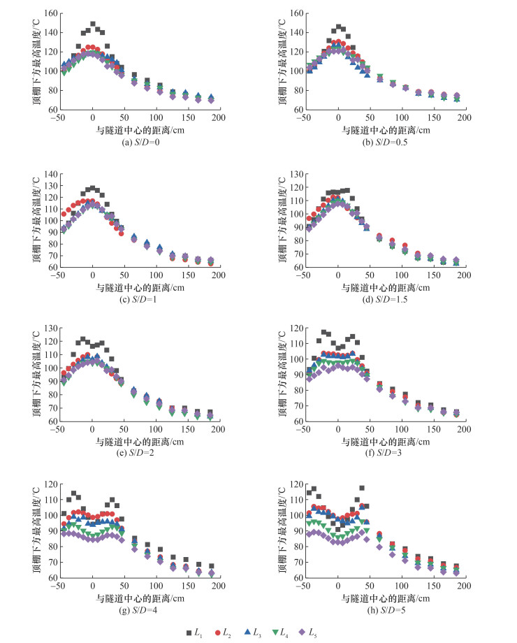 4 顶棚下方烟气温度纵向分布 4.1 顶棚下方最高温度纵向分布确定各工况的“准稳定阶段”后,根据实验中顶棚下方的2排水平热电偶所测得“准稳定阶段”的最高温度值计算平均值,得到图 7所示的不同工况下隧道内顶棚下方烟气平均最高温度的纵向分布情况。整体看来,不同横向偏距和火源间距对双火源火灾远火源区域的烟气最高温度的纵向分布影响较小,而在近火源区域,顶棚下方的烟气最高温度与横向偏距呈负相关关系。当无量纲火源间距S/D≤1时,双火源火焰出现融合现象,随后火羽流大部分以单个羽流形式撞击顶棚,故顶棚下方的最高温度出现1个峰值;随着火源间距的增大,火源间相互竞争空气的作用逐渐减弱,火焰开始出现分离式倾斜,烟气最高温度“单峰”变缓,开始向“双峰”过渡,贴壁火的温度分布由于侧壁的拖曳最先出现“双峰”;当S/D≥4时,双羽流表现出明显的独立状态,各自撞击火源上方附近的顶棚,此时最高温度曲线图出现2个峰值。在侧壁与顶棚的耦合限制下,隧道双火源火灾特征变得更为复杂,贴壁火顶棚下方的温度与中心火的有明显差别。这是由受限火羽流竖向扩展与水平蔓延阶段的2种非对称卷吸机制导致的。火焰竖向扩展阶段受水平不对称空气卷吸的影响,而顶棚射流阶段则受竖直不对称空气卷吸的影响,且卷吸受限程度随火源横向偏距的减小而增强。此时高温可燃气体需要运动更远的距离才能获得足够的氧气,于是贴壁火附近易积累高温烟气,故贴壁火处的温度明显高于其他横向偏距处的温度。
