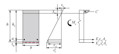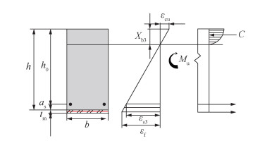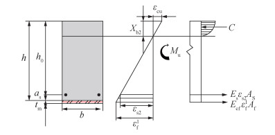 | $ \begin{gathered} M_{\mathrm{u}}=E_{\mathrm{s}} \varepsilon_{\mathrm{s}} A_{\mathrm{s}}\left(h_0-\frac{1}{3} X_{\mathrm{b}}\right)+ \\ E_{\mathrm{cf}} \varepsilon_{\mathrm{f}} A_{\mathrm{f}}\left(h+\frac{t_{\mathrm{m}}}{2}-\frac{1}{3} X_{\mathrm{b}}\right). \end{gathered} $ | (12) |