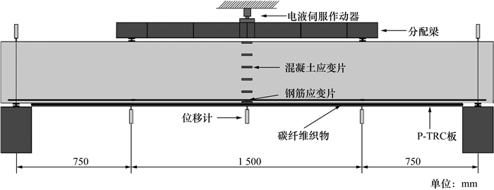 试验采用四分点加载,弯剪段长度为750 mm,纯弯段长度为1 500 mm。在正式加载前实施预加载,按梁受力阶段分三级加载,每级荷载分别为:梁底开裂前10 kN/级、底筋屈服前5 kN/级,底筋屈服后10 kN/级。荷载接近破坏荷载时采用位移缓慢加载,直至荷载降低到破坏荷载的85%时停止加载,宣布破坏。测点布置如图 3所示。
