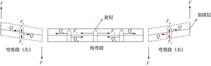 P-TRC板加固梁的受弯破坏类型主要有3种:1) 受压区混凝土被压坏,2) P-TRC板拉断破坏,3) P-TRC板与梁底剥离破坏。本文对应的加固梁破坏模式如图 4a—4c所示,分别为P-TRC板拉断破坏、射钉弯曲,加固梁弯曲破坏。未加固梁的弯曲破坏模式如图 4d所示,为受压区混凝土压碎破坏。以加固梁纯弯段与弯剪段特殊位置的射钉为例,其受力分析如图 5所示,加固梁纯弯段中间射钉两侧混凝土拉力大小相等,方向相反,跨中挠度最大处射钉不受剪力,纯弯段左侧与右侧射钉受到的剪力Qw由于受力不在同一水平面,左侧射钉集中力偶为逆时针旋转,右侧为顺时针旋转。RC梁底拉力F1由纯弯段至弯剪段逐渐减小,弯剪段射钉的剪力Q在施荷前期较小,待纯弯段两侧射钉在集中力偶作用下产生倾斜,Q逐渐增加,同时弯剪段由于支座和四分点处加载的力F形成集中力偶,使得RC梁对射钉产生法向的拉力Fh,此拉力由射钉打入混凝土的紧固力和Q产生的摩擦力Ff提供。