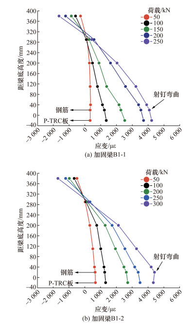 以表 2中设计的加固梁B1-1和B1-2为例,其应变—荷载曲线如图 6所示,射钉应变滞后随碳纤维织物层数增加而增大,加固层两侧射钉随荷载增大向内收缩,但跨中挠度最大处梁底与P-TRC板间并未出现较大滑移,整体符合平截面假定。