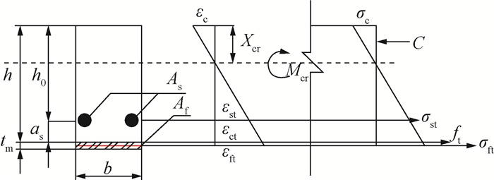 2.2 受弯破坏前承载力的计算 2.2.1 开裂荷载当加固梁受拉区边缘应变达到开裂应变,工作应力达到混凝土抗拉强度时,加固梁进入开裂状态,此时对应的跨中弯矩为Mcr,开裂荷载为Pcr,跨中挠度为δcr。截面计算简图如图 7所示,其中C为加固梁受压区混凝土合力。沿梁的X轴建立静力平衡方程。
