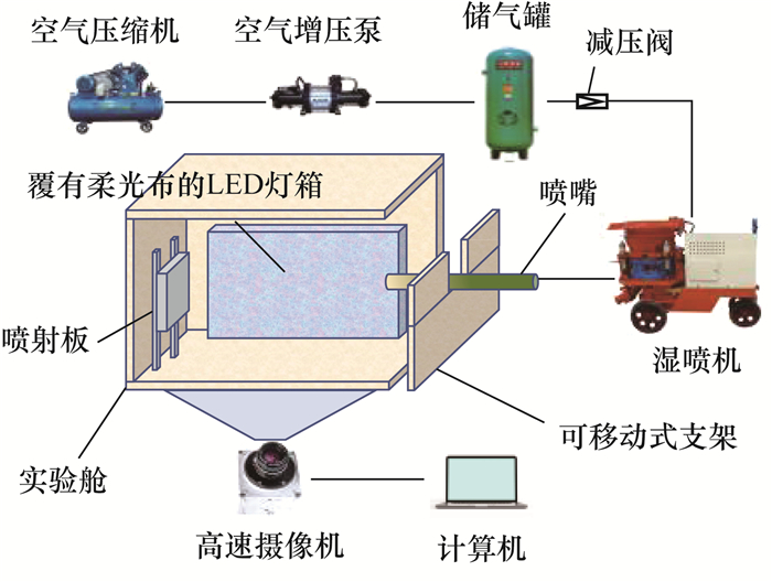 1 实验材料与方法 1.1 实验平台搭建喷射射流多维测试平台由混凝土湿喷机、供气系统、实验舱和拍摄系统构成。其中,供气系统由空气压缩机、空气增压泵、储气罐和减压阀组成,拍摄系统由高速摄像机和计算机组成。实验舱内设有喷射板、覆有柔光布的LED灯箱和可移动式支架,如图 1所示。