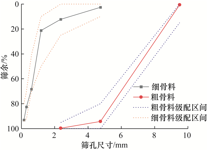 1.2 实验原料实验选用唐山福顺水泥有限公司的PO42.5普通硅酸盐水泥,技术指标符合GB175—2023 《通用硅酸盐水泥》[15]。粗骨料为公称粒级为5.00~10.00 mm的破碎石灰岩,细骨料为公称粒级为0.16~5.00 mm的天然河砂,细度模数为2.71,粗细骨料均符合JGJ52—2006 《普通混凝土用砂、石质量及检验方法》[16]。减水剂为江苏苏博特新材料股份有限公司的PCA®-Ⅰ聚羧酸高性能减水剂,产品符合GB8076—2008《混凝土外加剂》[17]、GB18588—2001《混凝土外加剂中释放氨的限量》[18]。