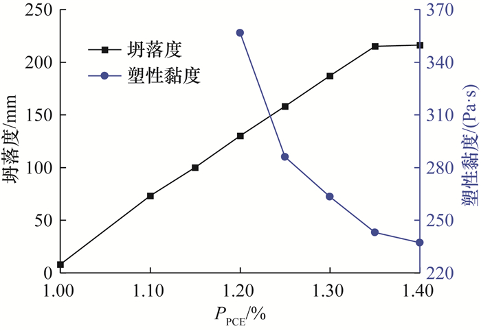工程现场主要以坍落度评判混凝土的流动性,本文采用坍落度、塑性黏度二项指标评判拌合物的流动性[19]。坍落度测试方法按GB/T 50080—2016《普通混凝土拌合物性能试验方法标准》[20]规定进行,混凝土塑性黏度选用Germann Instruments的ICAR Plus混凝土流变仪进行测试,通过阶梯法测试坍落度大于130.00 mm混凝土的塑性黏度。实验结果如图 3所示,图中PPCE为PCE的掺量。
