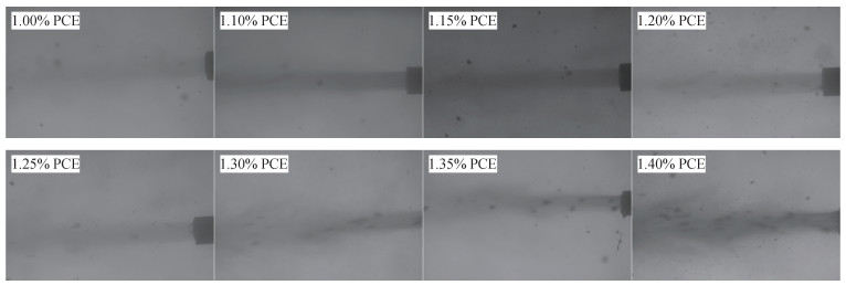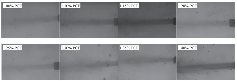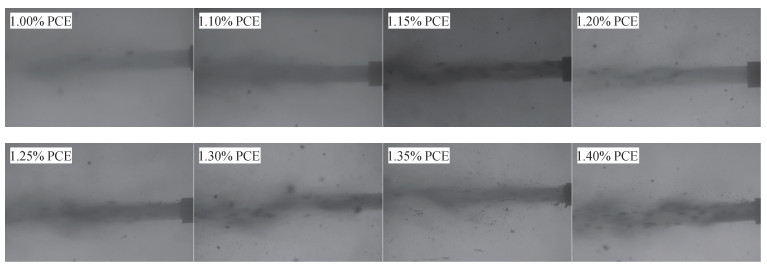 2.1 减水剂掺量对射流初始期和结束期的影响不同PCE掺量条件下初始期射流图片如图 4所示,结束期射流图片如图 5所示。